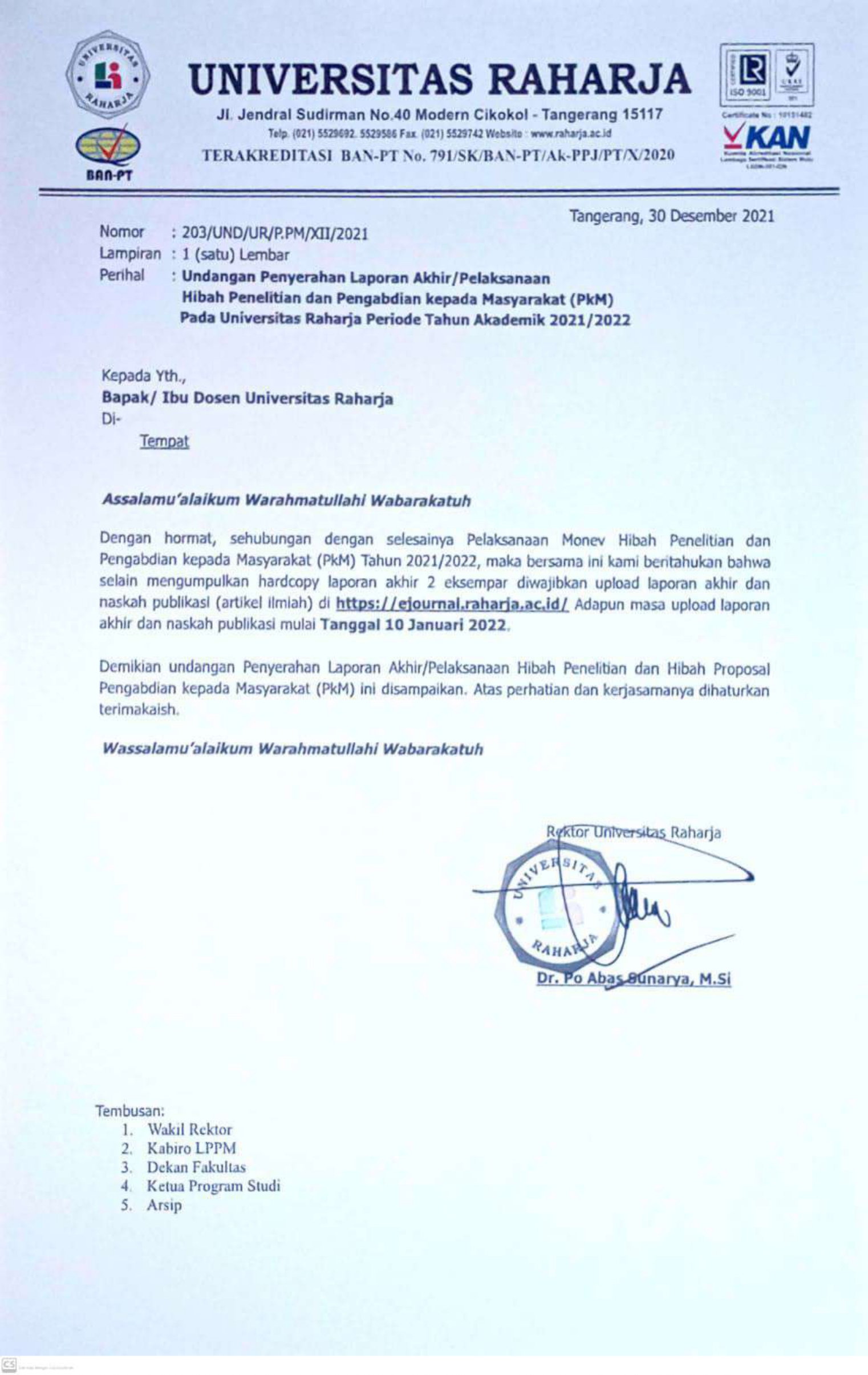 Universitas Raharja melalui Lembaga Penelitian dan Pengabdian kepada Masyarakat (LPPM) mengumumkan kepada seluruh Bapak/Ibu Dosen selaku Ketua Pelaksana Hibah Penelitian dan Pengabdian kepada Masyarakat (PkM) Tahun 2021/2022 untuk segera menyerahkan Laporan Akhir Pelaksanaan kegiatan.